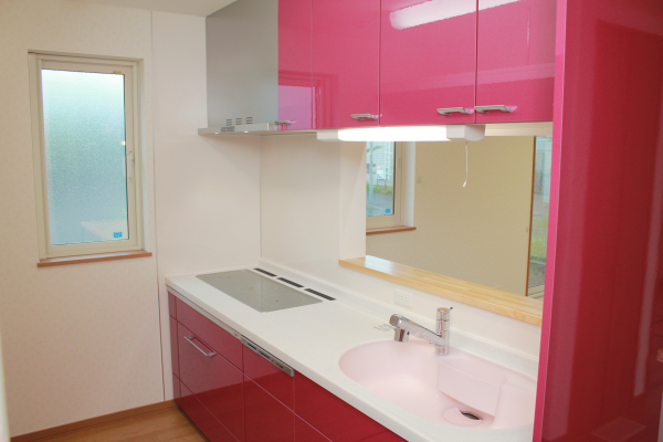 ▲光輝くベリーレッド色!ハイグレードタイプのキッチンです。
